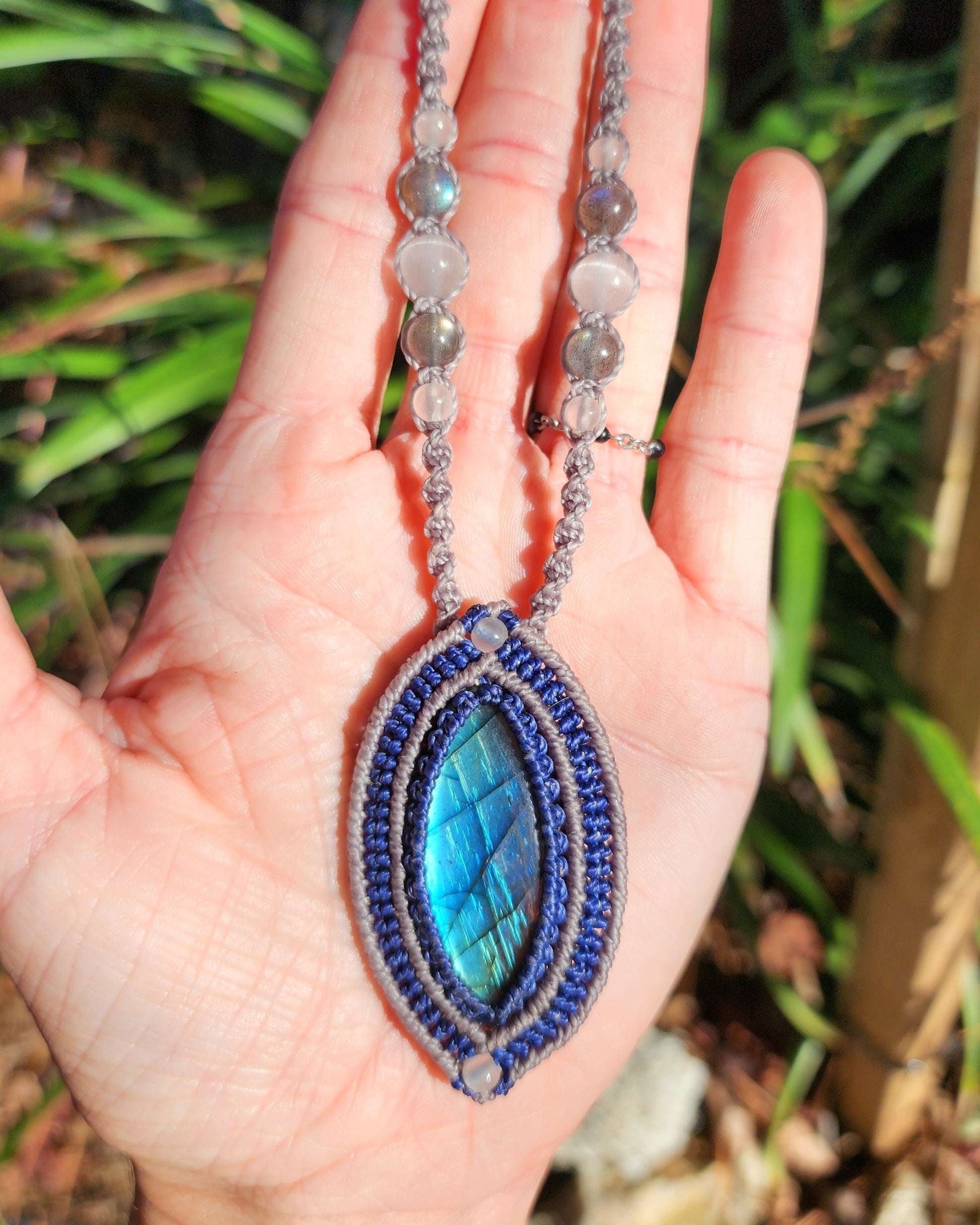This Blue Labradorite has been lovingly hand wrapped using the Micro-Macrame art form, which creates designs using only various knots. Each piece begins as just a spool of cord and there is no glue holding the stones in place, it is 100% knot-work. The Labradorite is paired with Labradorite and Satin Spar Selenite accent beads. It has been wrapped in light grey cording with dark river blue accent cording. Adjustable via a sliding knot in the back up to ~33".