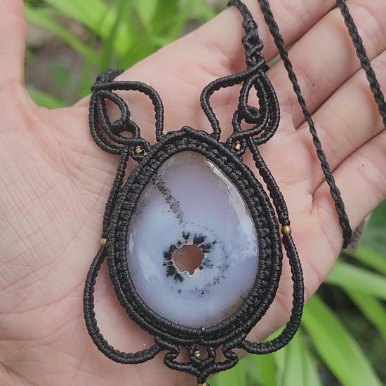 This Dendritic Opal aka Merlinite has been lovingly hand wrapped using the Micro Macrame art form, which creates designs using only various knots. Each piece begins as just a spool of cord and there is no glue holding the stones in place, it is 100% knotwork. The Dendritic Opal is paired with brass accent beads. It has been wrapped in black cording. Adjustable via a sliding knot in the back up to ~27".