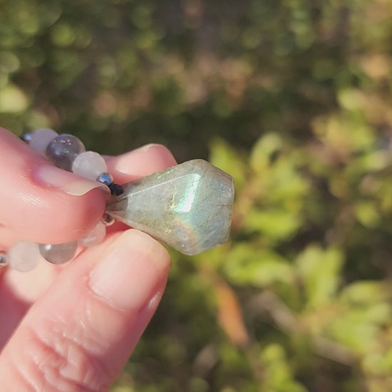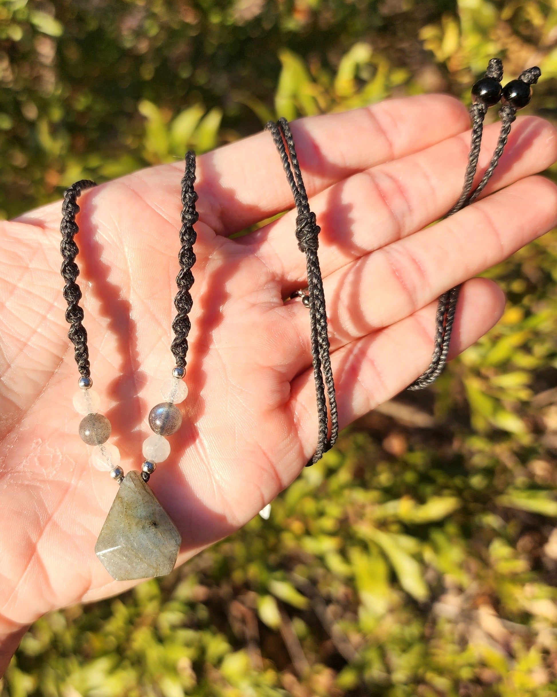 This Labradorite has been lovingly hand wrapped using the Micro-Macrame art form, which creates designs using only various knots. Each piece begins as just a spool of cord and there is no glue holding the stones in place, it is 100% knot-work. The Labradorite is paired with Labradorite, Rainbow Moonstone, and Stainless Steel accent beads. It has been wrapped in black cording. Adjustable via a sliding knot in the back up to ~33".