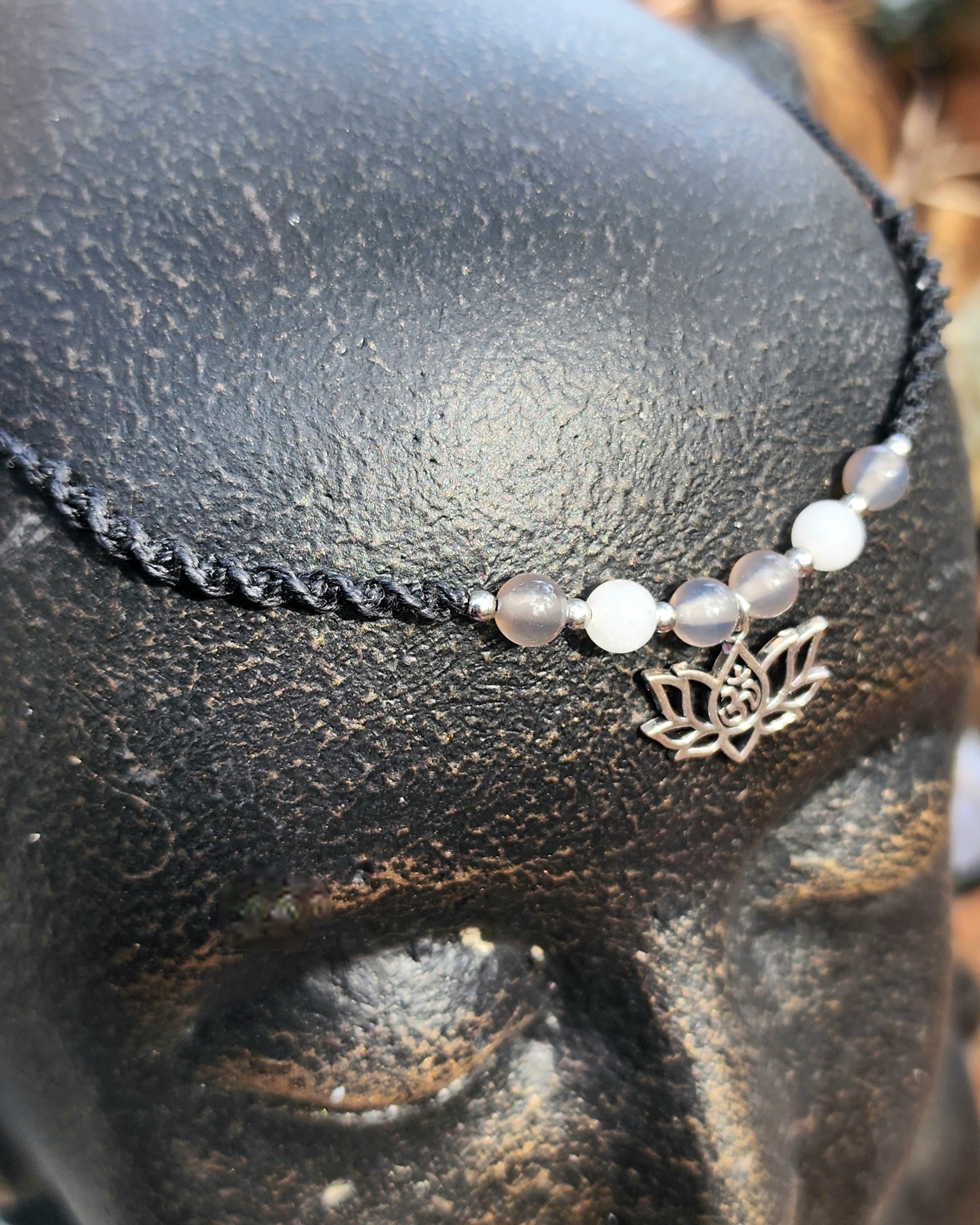 This Lotus Charm has been lovingly hand wrapped using the Micro-Macrame art form, which creates designs using only various knots. Each piece begins as just a spool of cord and there is no glue holding the stones in place, it is 100% knot-work. The Lotus is paired with either Lavender Rose Quartz & Blue Apatite beads OR Grey Agate & Quartz beads with Stainless Steel accent beads. It has been wrapped in either light grey OR black cording. Adjustable via a sliding knot in the back up to ~32".