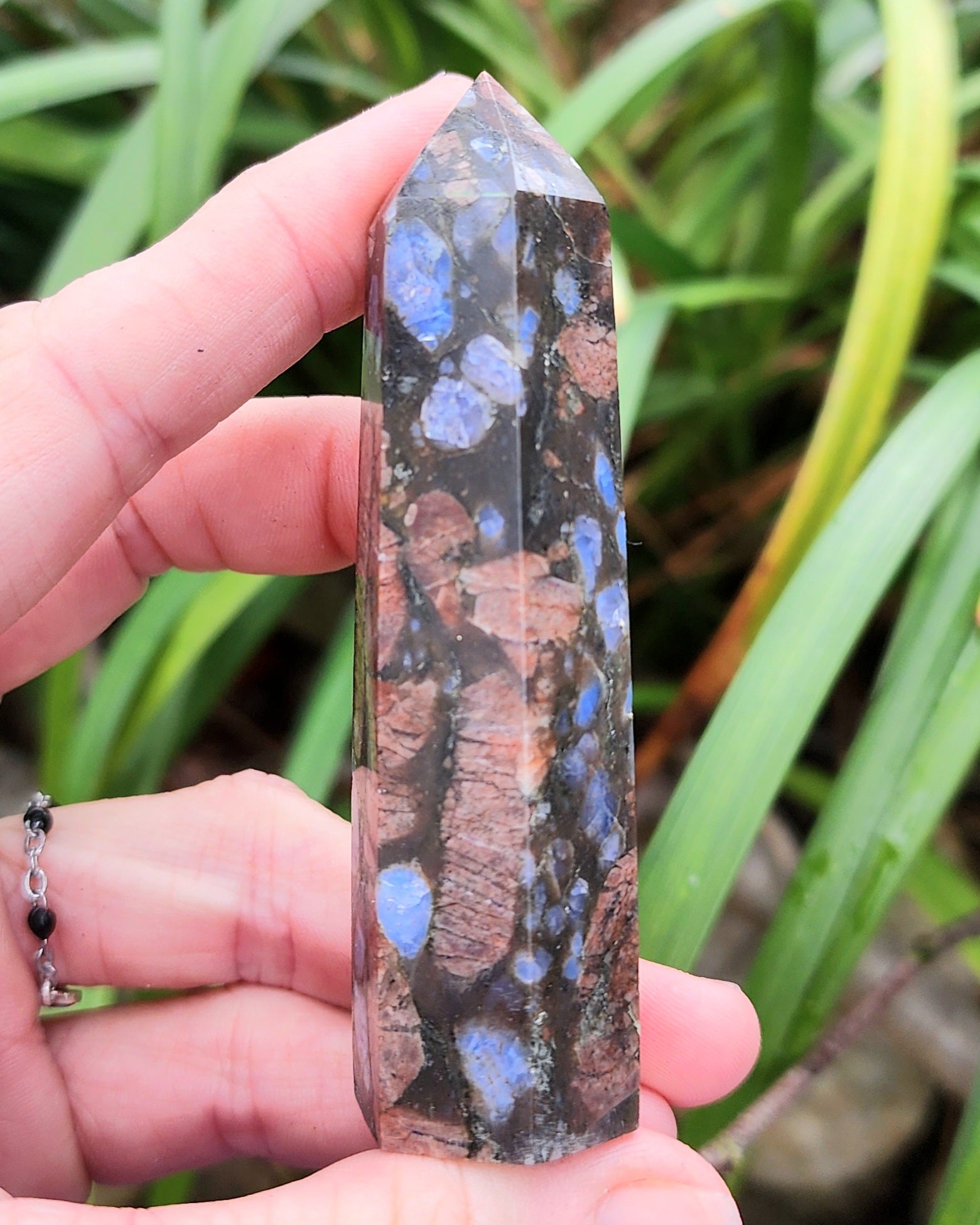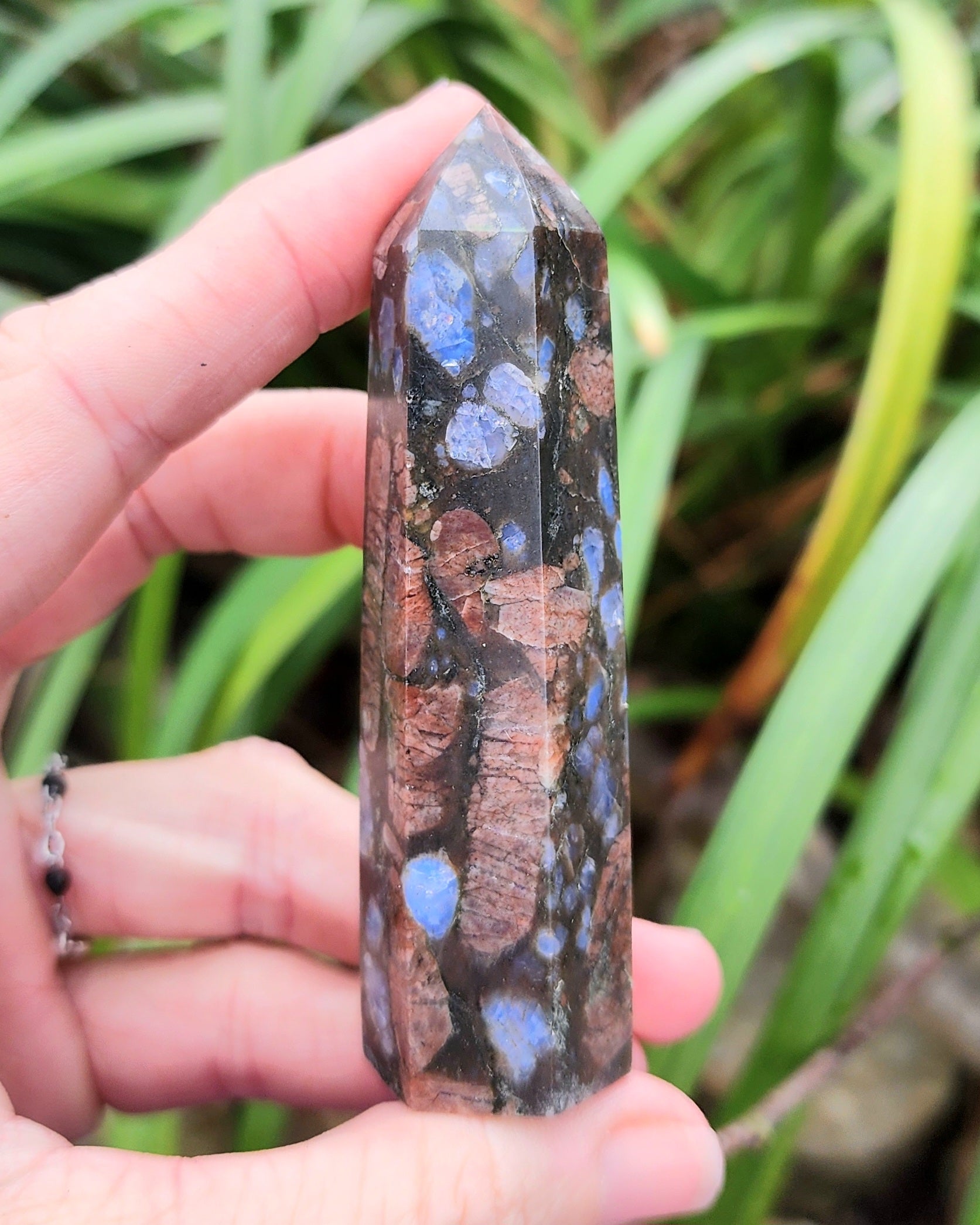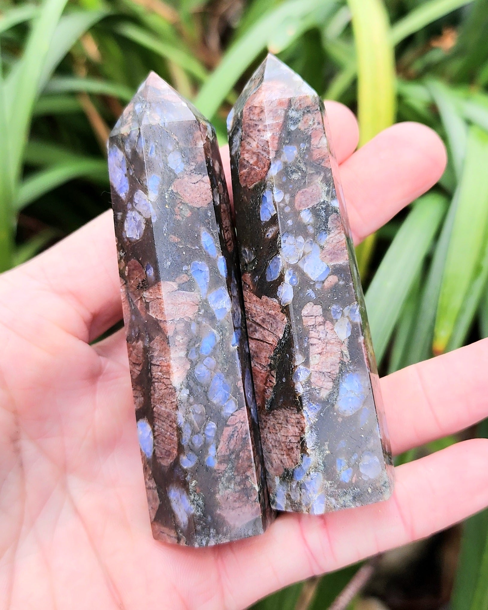 Que Sera is a blend of Quartz, Feldspar, and Biotite, with distinctive inclusions of Blue Quartz and Pink Feldspar embedded in a fine-grained matrix of granite-like material. Que-Sera Stone supports standing in your own power and provides release from the burden of self-imposed obligations. It is said to soothe, energize, re-balance, and restore. It is said to plug you into the Power Supply of the Universe, drawing in life force energy. It provides intense focus to your life path.