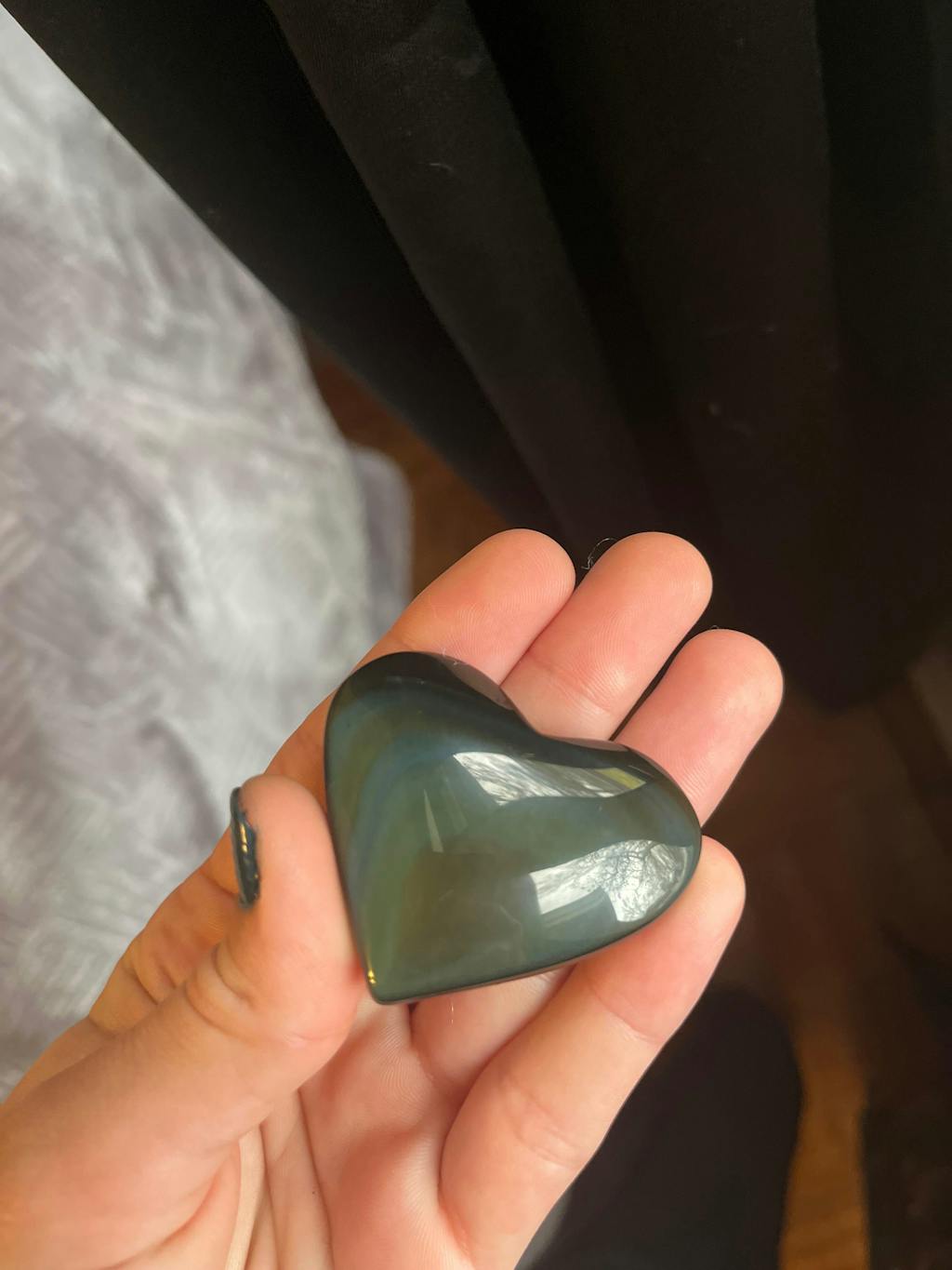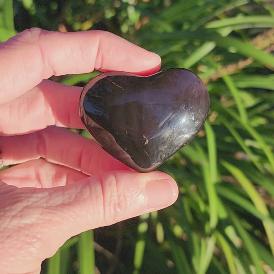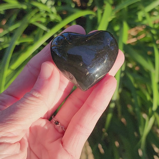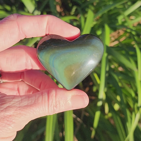 These may look like normal black obsidian at first, but when viewed under bright lighting at certain angles the colors become visible. Some have a mix of green/blue/orange, some have more purple. Choose yours.
