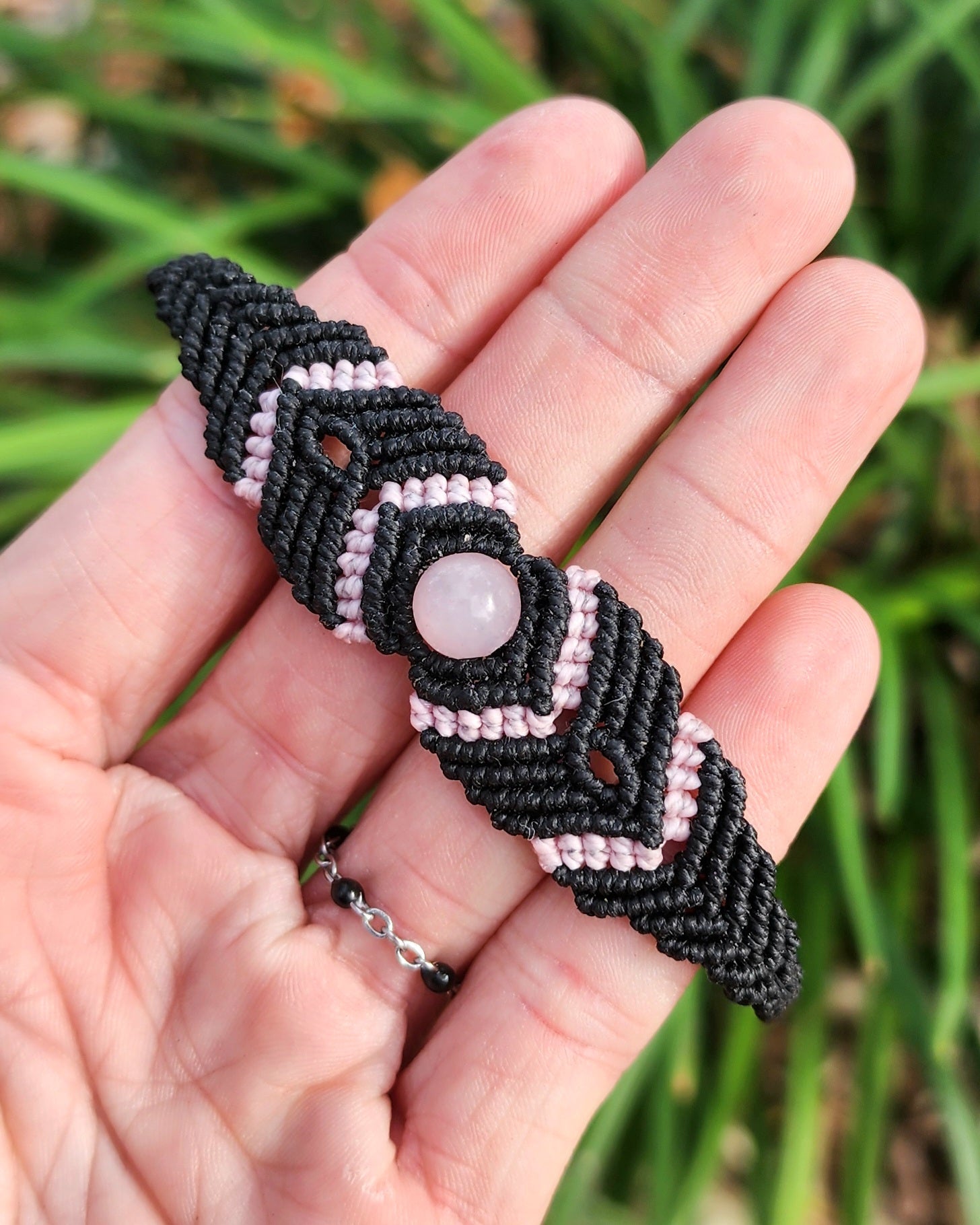 This Rose Quartz has been lovingly hand wrapped using the Micro-Macrame art form, which creates designs using only various knots. Each piece begins as just a spool of cord and there is no glue holding the stones in place, it is 100% knot-work. It has been wrapped in Black cording with light pink cord accents. Adjustable via a sliding knot in the back up to 9.5".