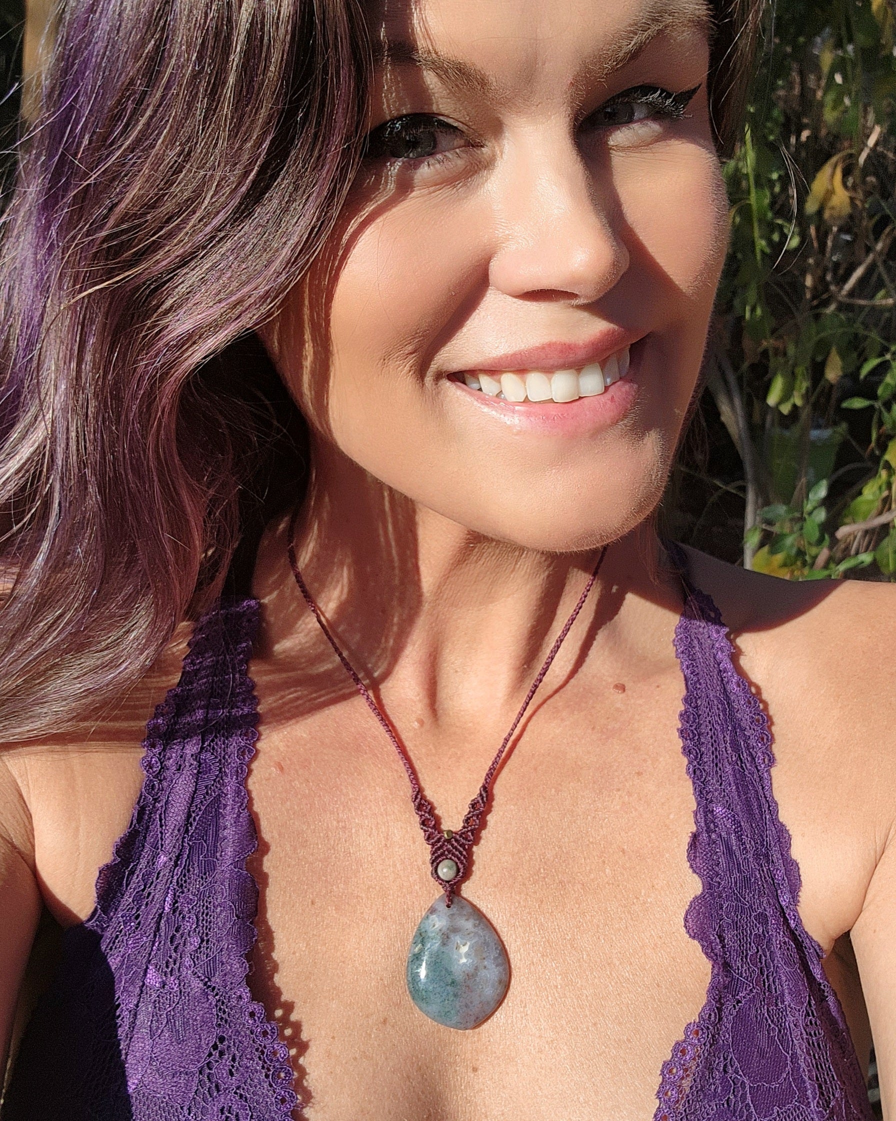This Sea Jasper has been lovingly hand wrapped using the Micro-Macrame art form, which creates designs using only various knots. Each piece begins as just a spool of cord and there is no glue holding the stones in place, it is 100% knot-work. The Sea Jasper is paired with Sea Jasper and Brass accent beads. It has been wrapped in dark black cherry cording. Adjustable via a sliding knot in the back up to ~40".