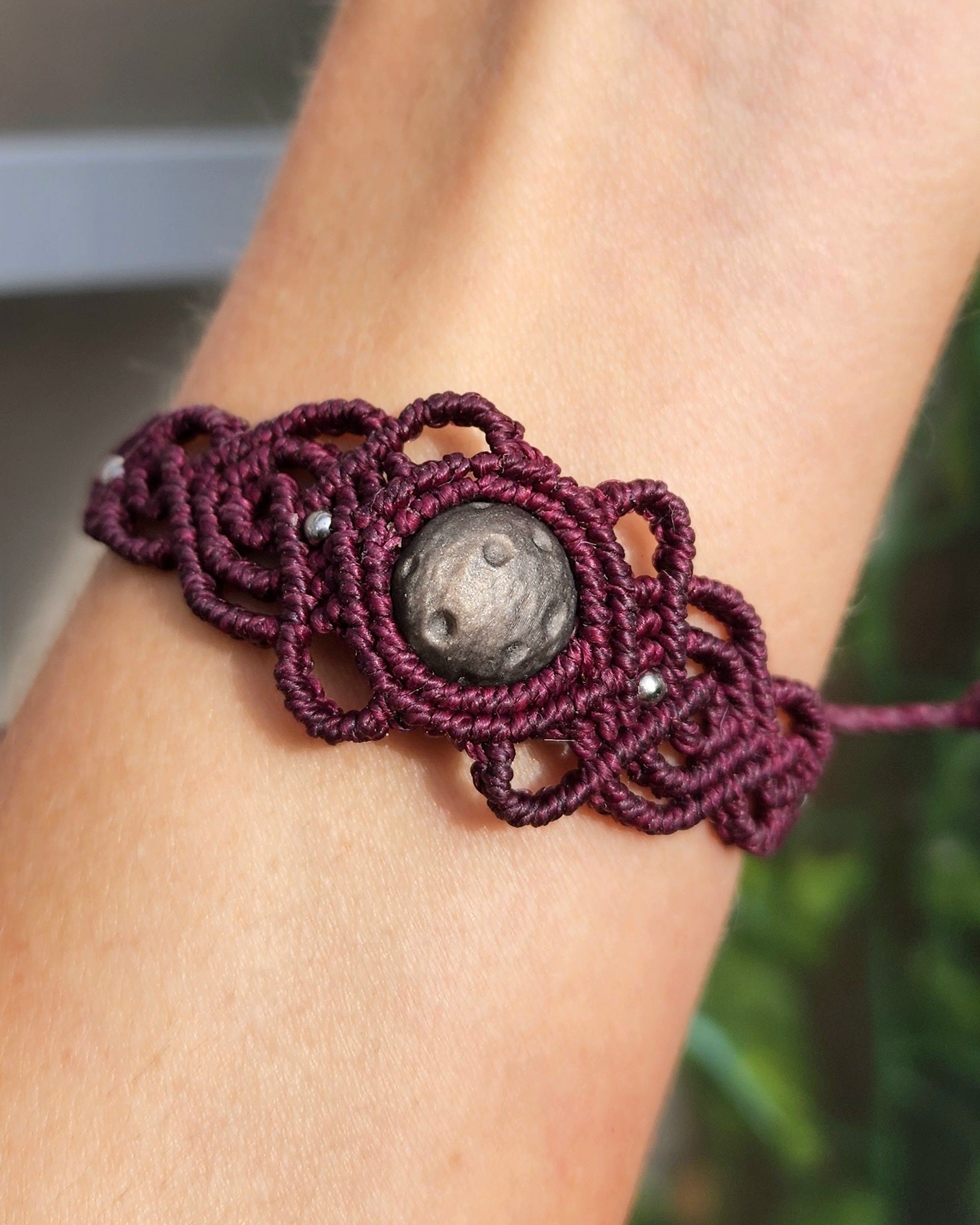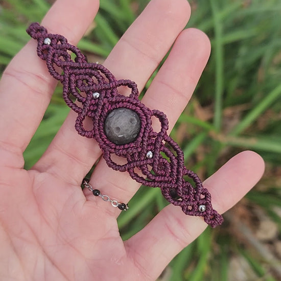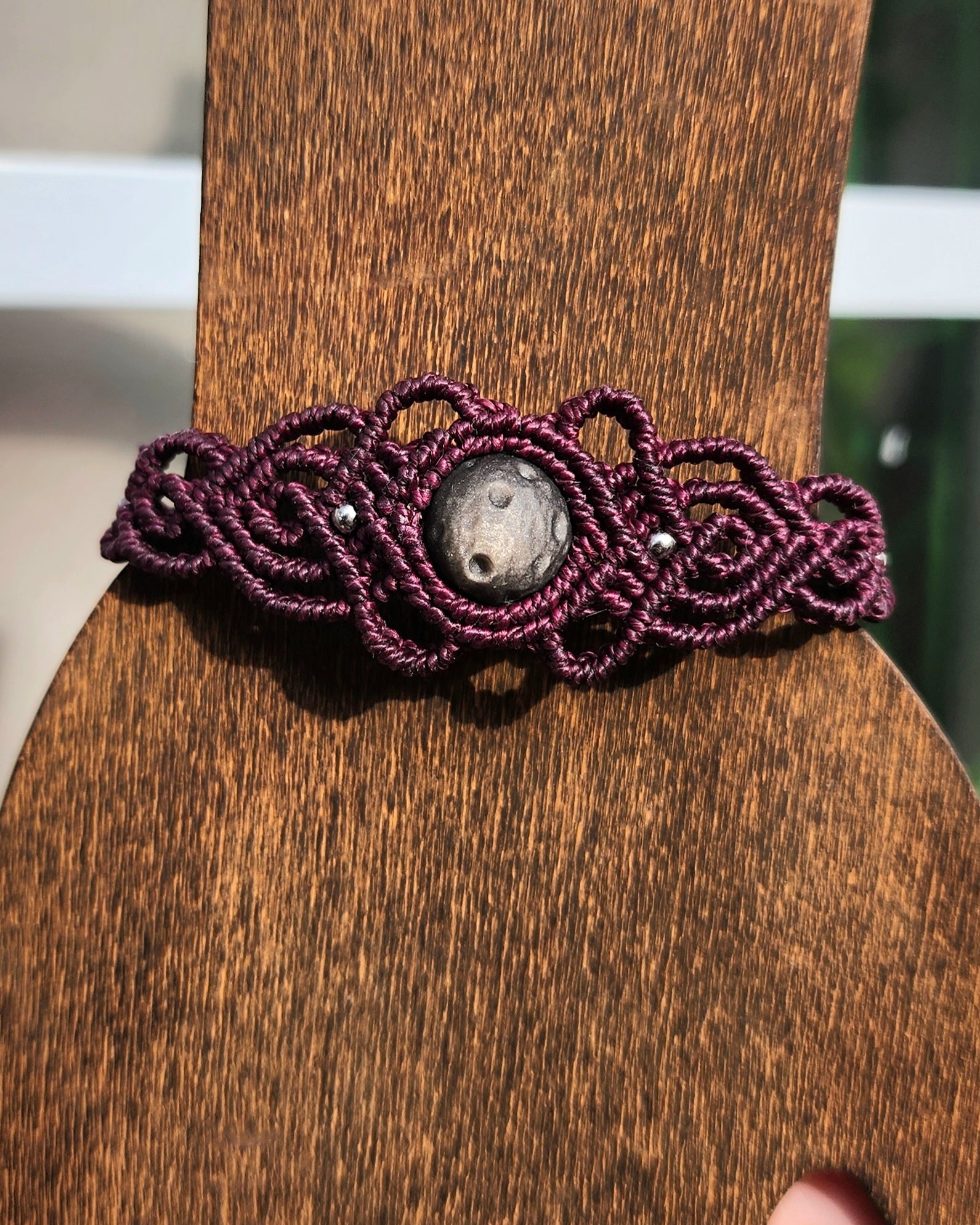 This Silver Sheen Obsidian Full Moon has been lovingly hand wrapped using the Micro-Macrame art form, which creates designs using only various knots. Each piece begins as just a spool of cord and there is no glue holding the stones in place, it is 100% knot-work. It has been wrapped in dark black cherry cording, and paired with Stainless Steel accent beads. Adjustable via a sliding knot in the back up to 9.5".
