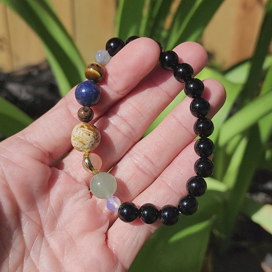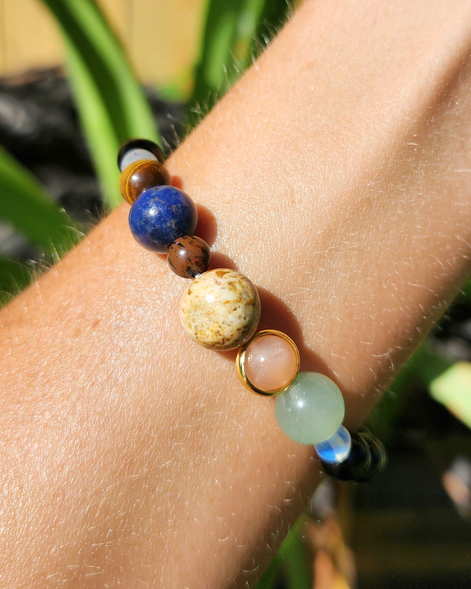These bracelets are made with 6mm Labradorite as Mercury, 8mm Tiger's Eye as Venus, 10mm Sodalite as Earth, 6mm Magogany Obsidian as Mars, 12mm Picture Jasper as Jupiter, 8mm Pink Aventurine with golden ring as Saturn, 10mm Green Aventurine as Uranus, 5mm Opalite as Neptune, and 8mm Black Onyx as the rest of the bracelet.