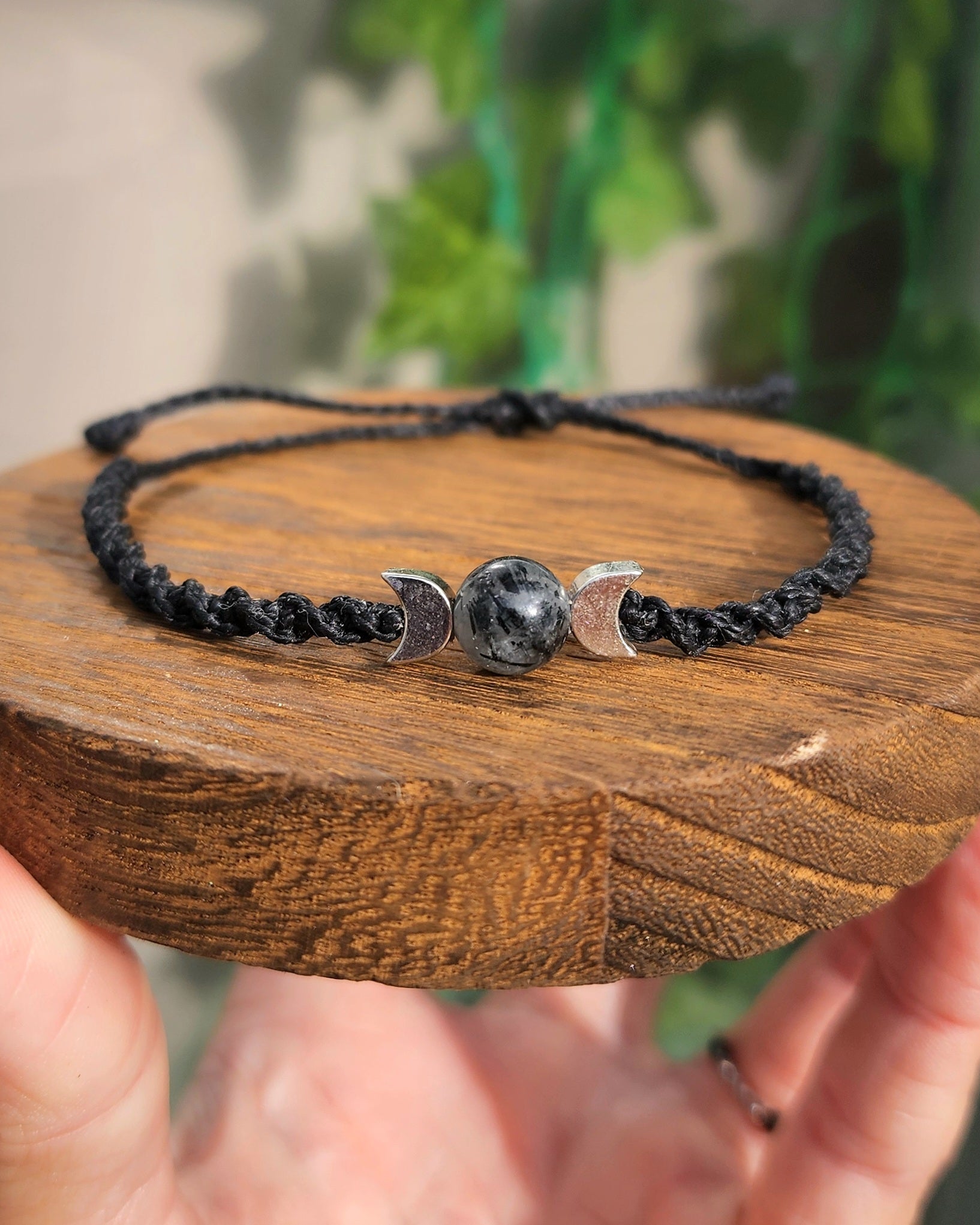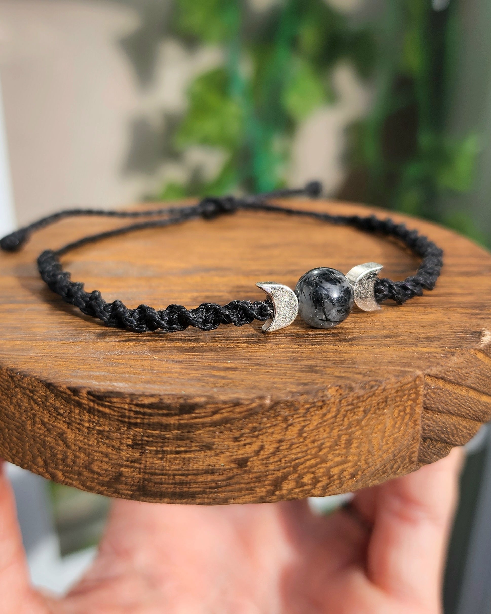 Black Tourmalinated Quartz Triple Moon Macrame Bracelet