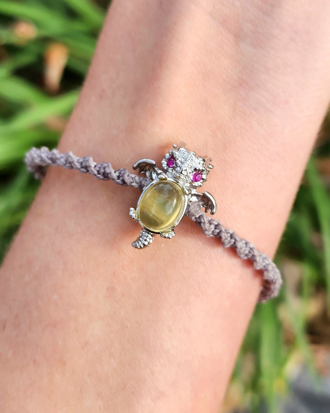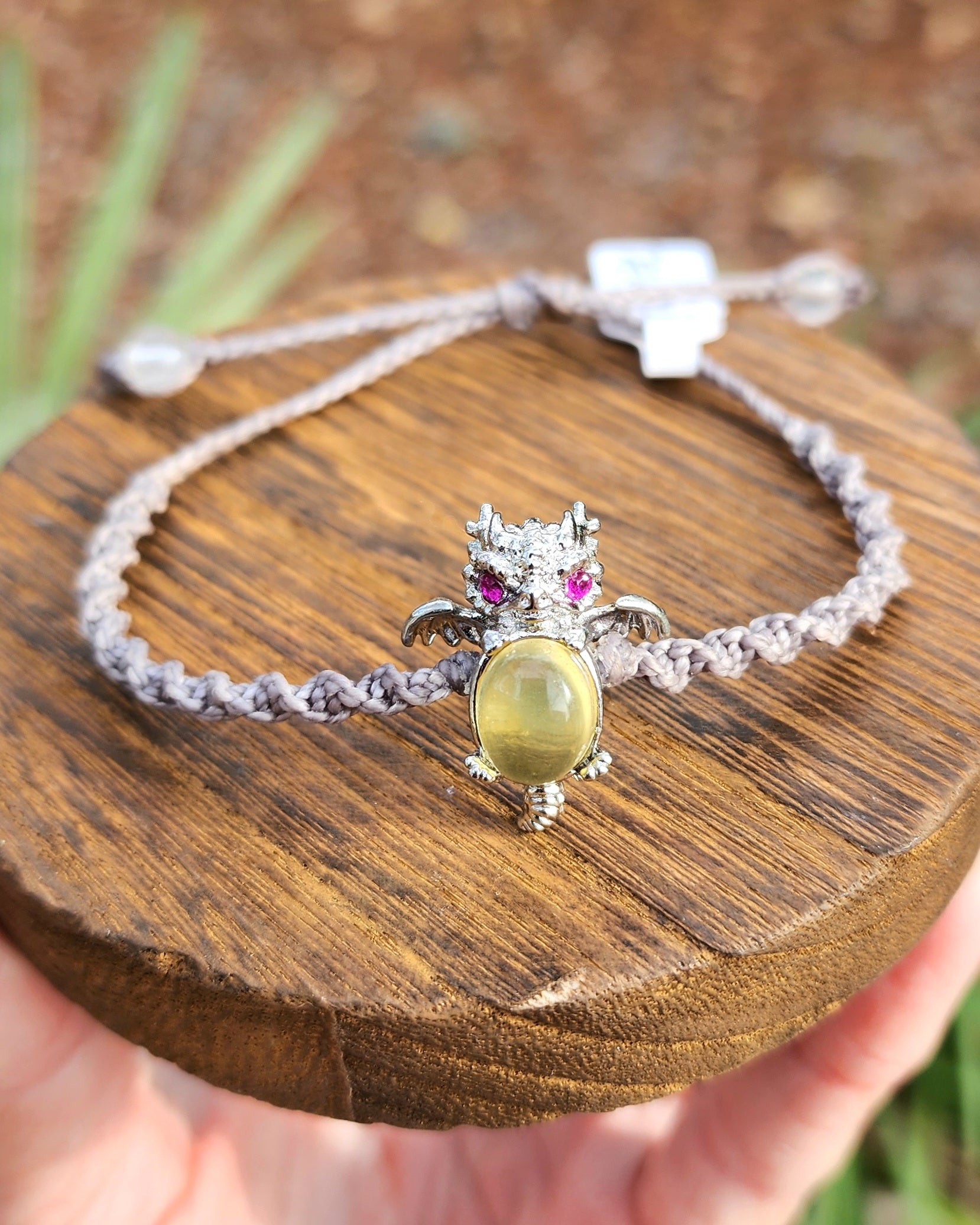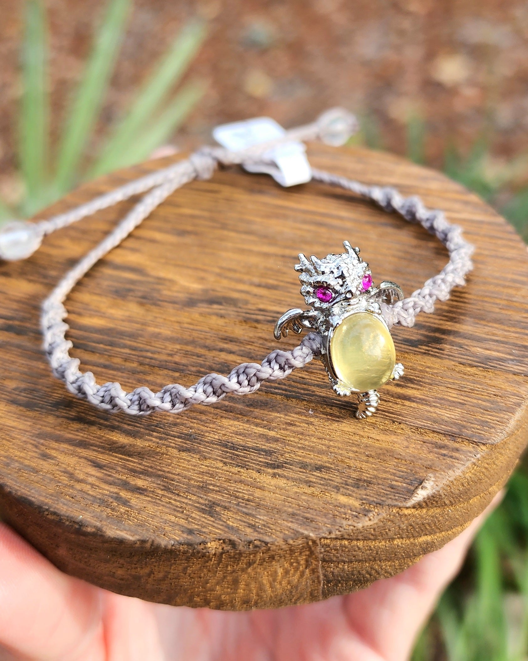 This Yellow Fluorite Dragon has been lovingly hand wrapped using the Micro-Macrame art form, which creates designs using only various knots. Each piece begins as just a spool of cord and there is no glue holding the stones in place, it is 100% knot-work. It has been wrapped in light grey cording. Adjustable via a sliding knot in the back up to 9".